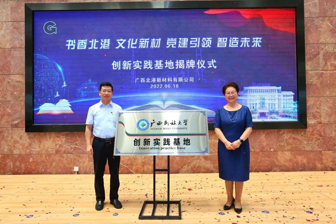 在热烈的掌声中,原自治区党委副书记、著名作家潘琦,中国作家协会委员会委员、广西文联主席东西,作家鬼子,广西作家协会副主席凡一平等广西文化界名人,广西民族大学传媒学院院长杨学明与北部湾港集团党委书记、董事长李延强,北港新材料公司党委书记、董事长潘料庭共同为“北港永不锈”书院、广西民族大学和北港新材料公司“创新实践基地”揭牌。