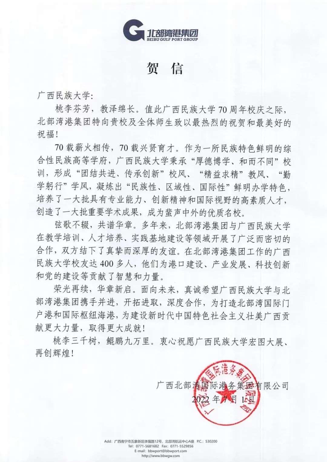 北部湾港集团向广西民族大学发去贺信赠言