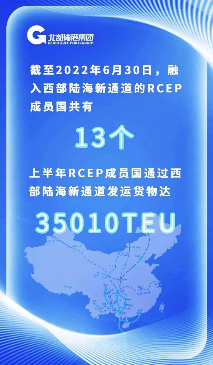上半年,RCEP成员国通过西部陆海新通道发运货物的国家达13个,发运量达35010TEU,占通道到发总运量(206758TEU)的17.00%。