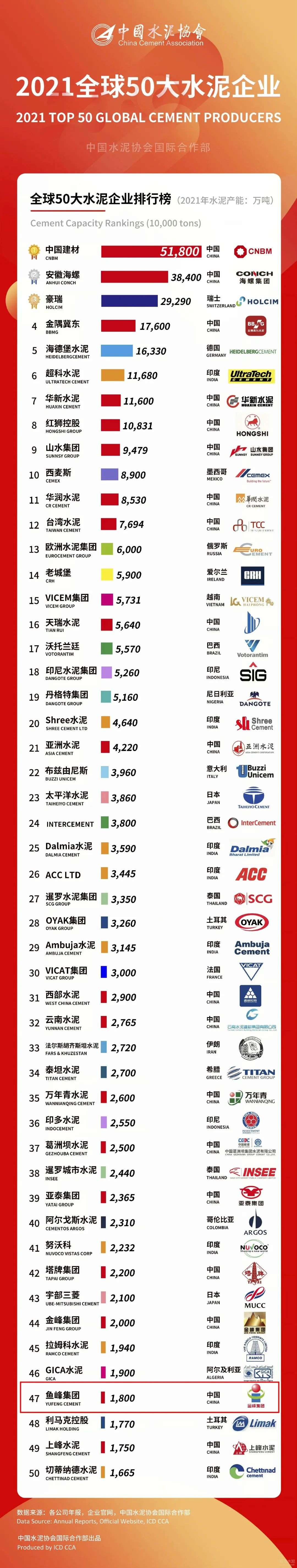 近日,中国水泥协会公布2021年度全球50大水泥企业,鱼峰集团榜上有名,以1800万吨产能位列第47名,是此次上榜的19家中国水泥企业之一。
