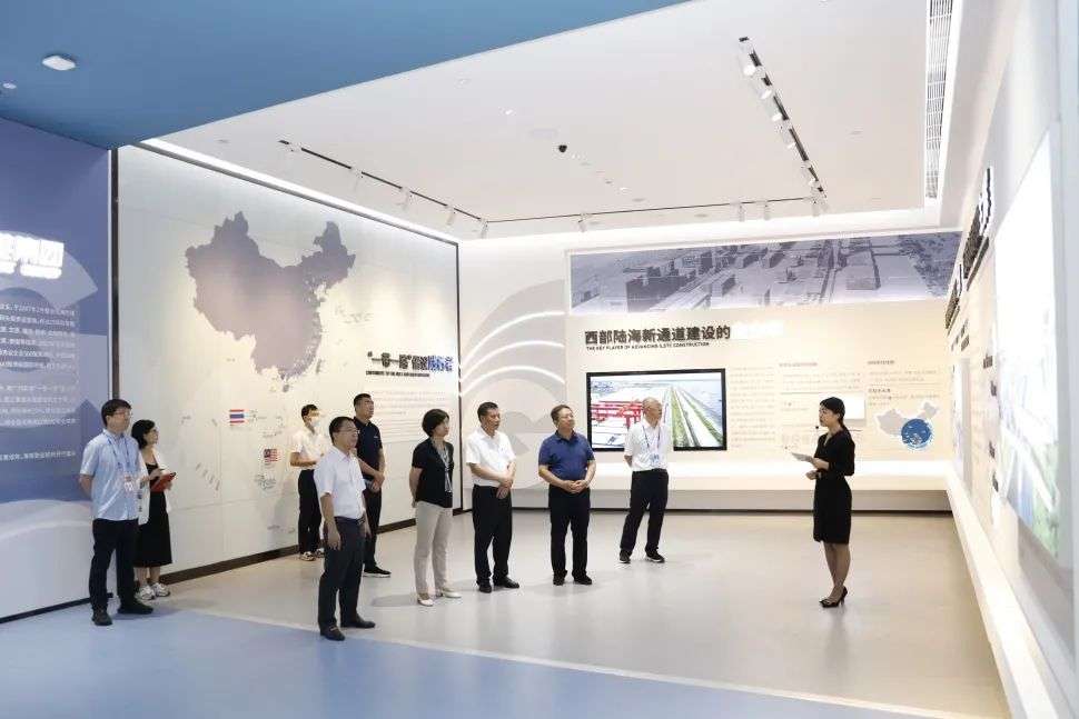 在西部陆海新通道北部湾港展厅,北部湾港集团党委副书记、工会主席、职工董事谢志双向任素芬一行重点介绍了北部湾港集团在西部陆海新通道建设中发挥的重要作用,北部湾国际门户港和国际枢纽海港建设成效,以及黄金水道建设的情况。