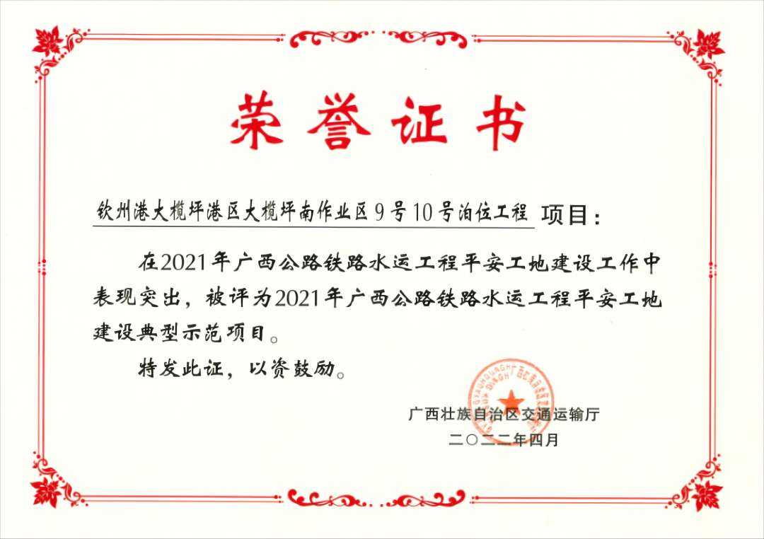 2021年6月,交通运输部督查组对项目开展安全质量督察工作,取得领导和专家的一致认可,沉箱预制技术被评价为行业2.0版本,为广西沿海水运工程近20年来最高评价。