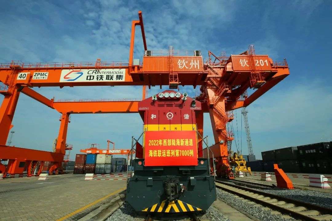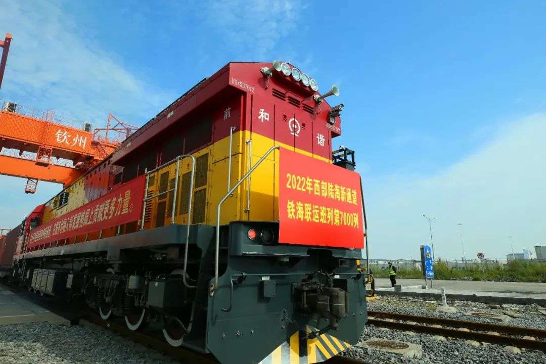 10月21日上午,满载着纸浆、石英砂、建筑陶瓷等货物的集装箱列车从钦州集装箱铁路中心站缓缓驶出,将在3天后到达重庆团结村站。这是2022年西部陆海新通道开出的第7000列海铁联运班列,提前71天完成了全年班列开行任务。