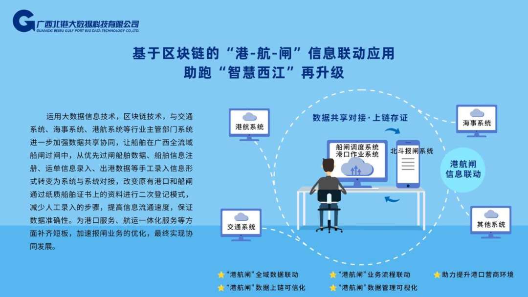 基于区块链的“港-航-闸”信息联动应用项目运用大数据信息技术,区块链技术,与交通系统、海事系统、港航系统等行业主管部门系统进一步加强数据共享协同,让船舶在广西全流域船闸过闸中,从优先过闸船舶数据、船舶信息注册、运单信息录入、出港数据等手工录入信息形式转变为系统与系统对接,改变原有港口和船闸通过纸质船舶证书上的资料进行二次登记模式,减少人工录入的步骤,提高信息流通速度,保证数据准确性。为港口服务、航运一体化服务等方面补齐短板,最终实现全流域数据联动、业务流程联动、数据上链可信化、数据管理可视化、提升港口营商环境。