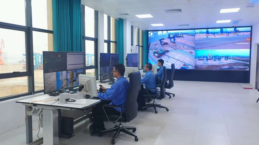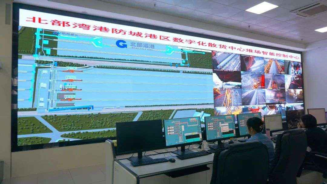 在防城港渔澫港区中心堆场这个全国沿海港口中为数不多的海铁联运自动化散货堆场里,开拓式运用5G通信、北斗定位、人工智能、数字孪生等高新技术,实现了58万平米散货堆场的智能控制和管理。该智能控制中心可远程操控堆场中的22条带式输送机、2座快速定量装车楼和4台斗轮堆取料机,实现“一键启停”安全高效全自动化堆取料作业,降本增效、提质优服成效十分显著。
