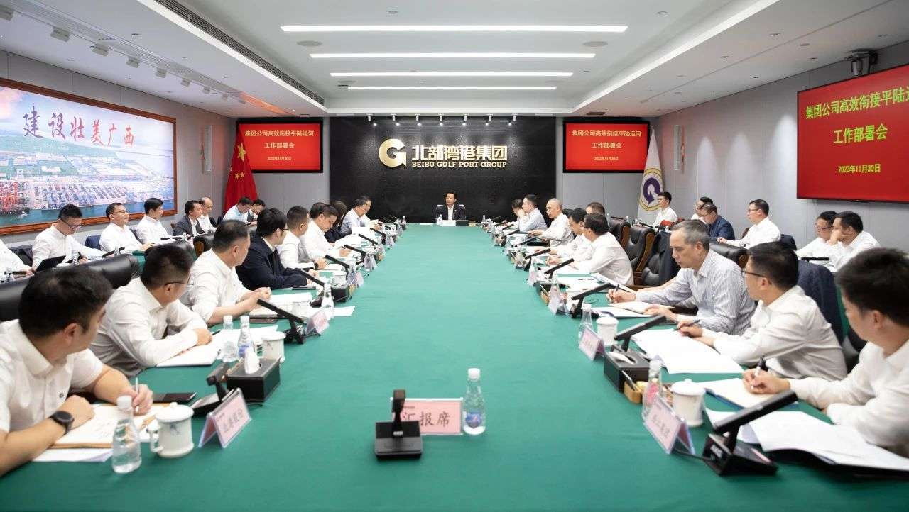 北部湾港集团提高政治站位,统一思想、凝聚力量,压紧压实责任,切实增强责任感和紧迫感,印发《高标准高质量衔接平陆运河构建广西协调发展的现代水运物流体系行动方案(2023—2026年)》(简称《行动方案》),并多次召开专项会议研究和部署平陆运河相关事宜。2023年10月12日,北部湾港集团党委书记、董事长周少波主持召开平陆运河物流运输组织相关研究专项工作专题会议。2023年11月30日,集团公司召开高效衔接平陆运河工作部署会,传达学习中央、自治区对平陆运河工程及平陆运河经济带建设的有关指示精神,贯彻落实集团公司制定印发的《行动方案》,全力以赴推动北部湾国际门户港、西江黄金水道与平陆运河的高效衔接。